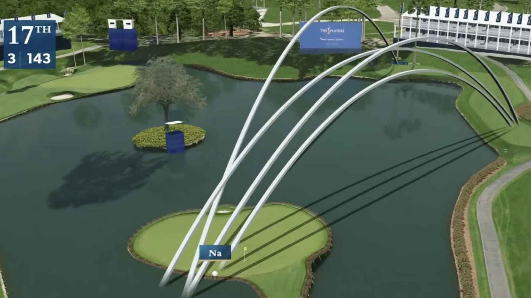 The distance from there to the pin is only 83 yards. From between 75 and 100 yards, the PGA Tour’s GIR average is more than 79 percent, with an average proximity of about 17 feet. But, of course, context matters, and Azinger’s right: The angle from drop zone to pin here really is terrible and has no room for error short, left or long. That said, the decision to use the drop zone itself is as much the issue as choosing the line to take. That’s why my advice would be, if you just dunked one in the water on 17, go up to the drop zone and don’t get cute with that pin. Forget about the flag; pitch it somewhere below the hole and try to make the putt.
