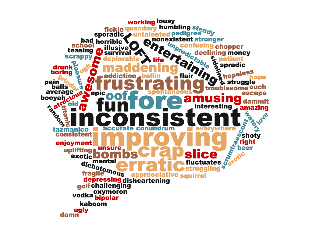 The responses came pouring in, and there was a clear winner: “Inconsistent,” which was the most-used phrase. The second-most used phrase was slightly more positive — “improving” — followed by another negative one — “fore”. “Erratic,” “fun” and “frustrating” were all honorable mentions.
