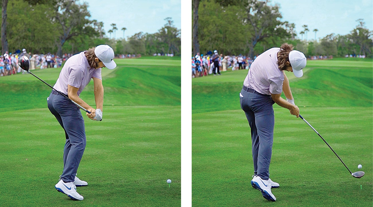 He’s moved his right elbow from behind and above his right hip (frame 2) to down and in front of it — a classic delivery. Important: The club is “lagging,” but Tommy isn’t holding anything back.