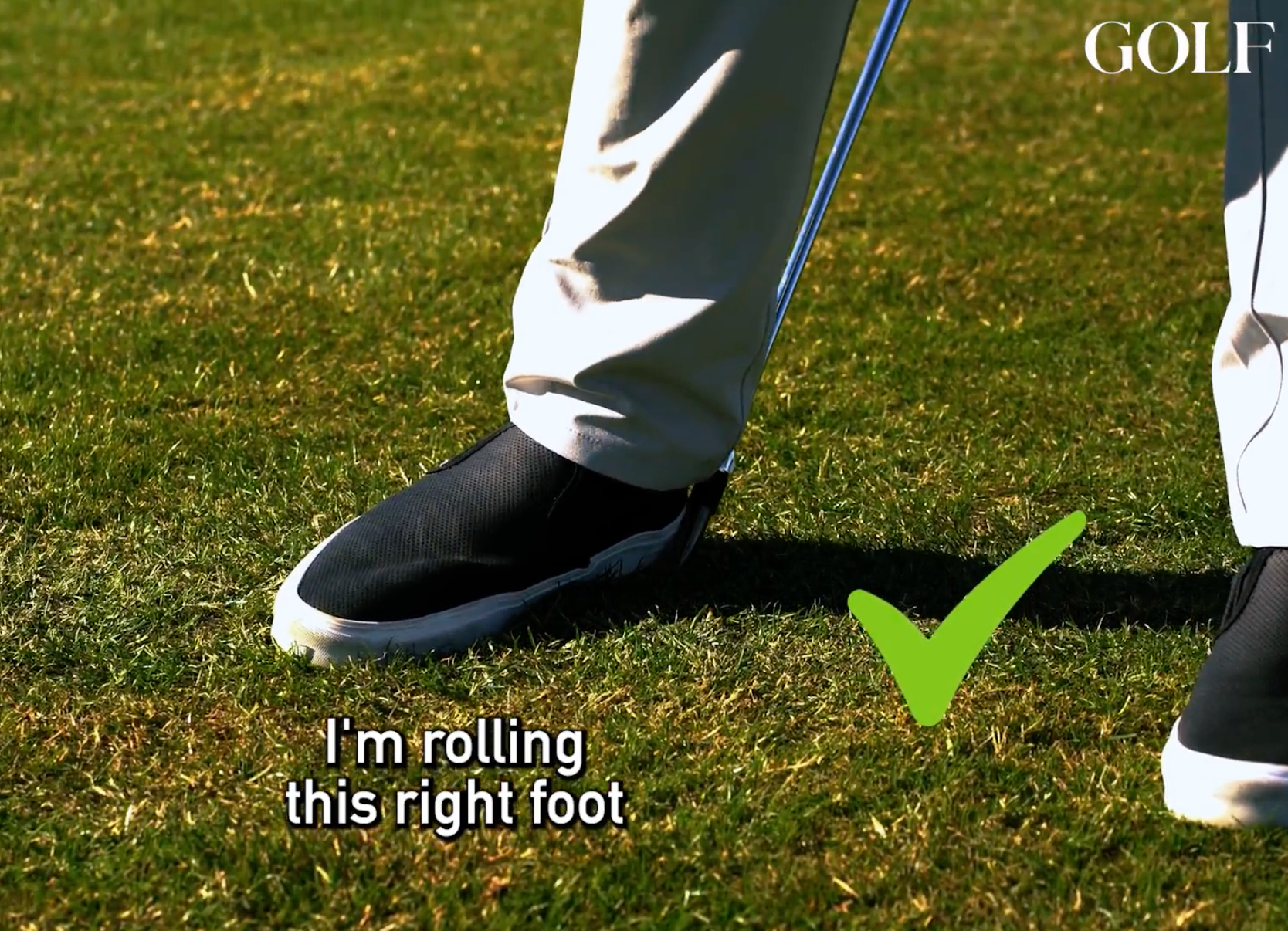 “Now we’ll do a couple little waist high, wayside practice swings. And what you’ll notice here is I’m rolling this right foot so that the right foot comes over to the left knee, and I’m not firing up onto the toe dropping the wedge.”