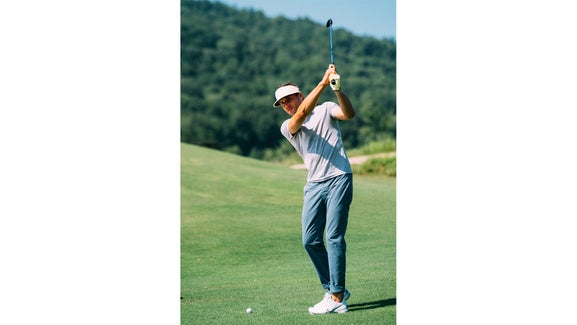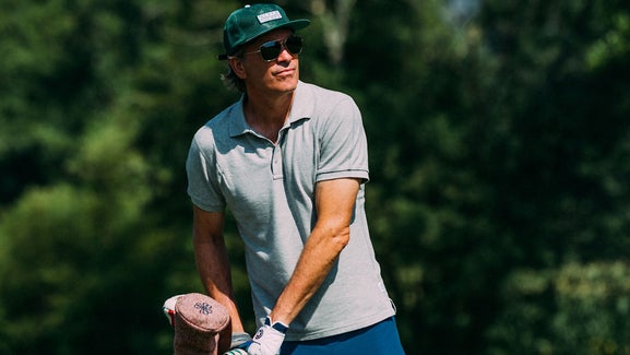 The Outfit: A look like this proves you don’t have to wear loud patterns to make a statement. The drawstring, elastic waistband on the Linksoul Drifter pants ($80) demands an untucked polo, and we opted to pair it with the athletic comfort of Lululemon’s Evolution polo ($98). The grey-on-grey ensemble allowed us to be a little more outgoing with our accessories, which is why we rounded out the outfit with Imperial’s fun terry cloth Sauciest Sauce visor ($30) and Asher’s canary glove ($24).