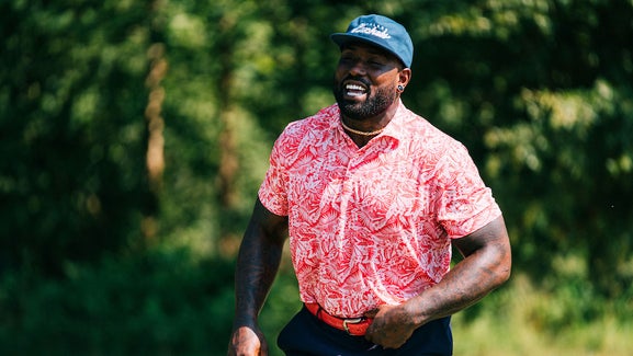 The Outfit: The Jonnie-O Willis polo ($89) is clearly a statement piece, and Delanie Walker proves you can be big and pull off a bold, eye-catching pattern. We opted to surround that polo with solid-colored basics — Malbon’s navy “Team Buckets” snapback cap ($42); a pair of navy FootJoy Performance lightweight shorts ($78); a red LEN Lifestyle stone-washed ostrich belt ($575); and white Adidas Code Chaos shoes ($150).