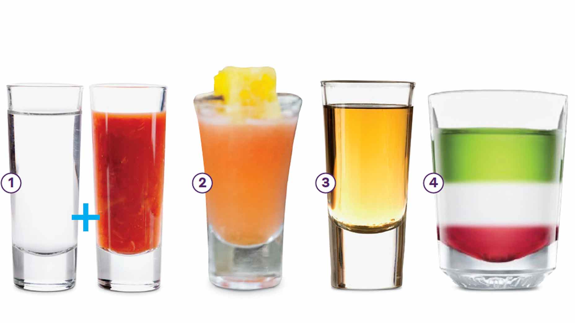 4. Mexican flag: You’ll need a spoon for this. Pour 1/3 oz grenadine into your glass, then float 1/3 oz tequila, then float 1/3 oz creme de menthe. To float the booze, pour it over the back of a spoon and let it drizzle into the glass. Esto no sabe a bandera!