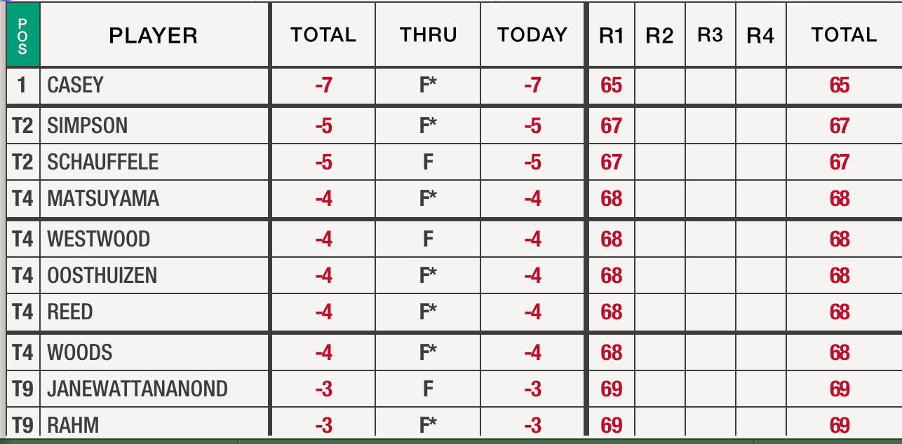 “I did everything well today,” Woods said later. “There’s nothing I think I did poorly.” Hard to argue with him. Woods made a bunch of easy pars on his way in Thursday afternoon. Here’s how the scoreboard looked from the opening half of the field.