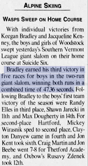 So it was with great eagerness that I dove into the newspaper archives to try to figure out just how good Bradley’s ski career actually was. Bradley’s of an age where his high school results are mostly pre-social media (plus Vermont may not have been first to the internet era), so it wasn’t like his skiing exploits were particularly Google-able. Thankfully, the Valley News was particularly useful in tracking down some race results. The findings: Keegan was fast! He wasn’t just a competent skier — he was one of the fastest in Vermont, a hotbed for ski racing.