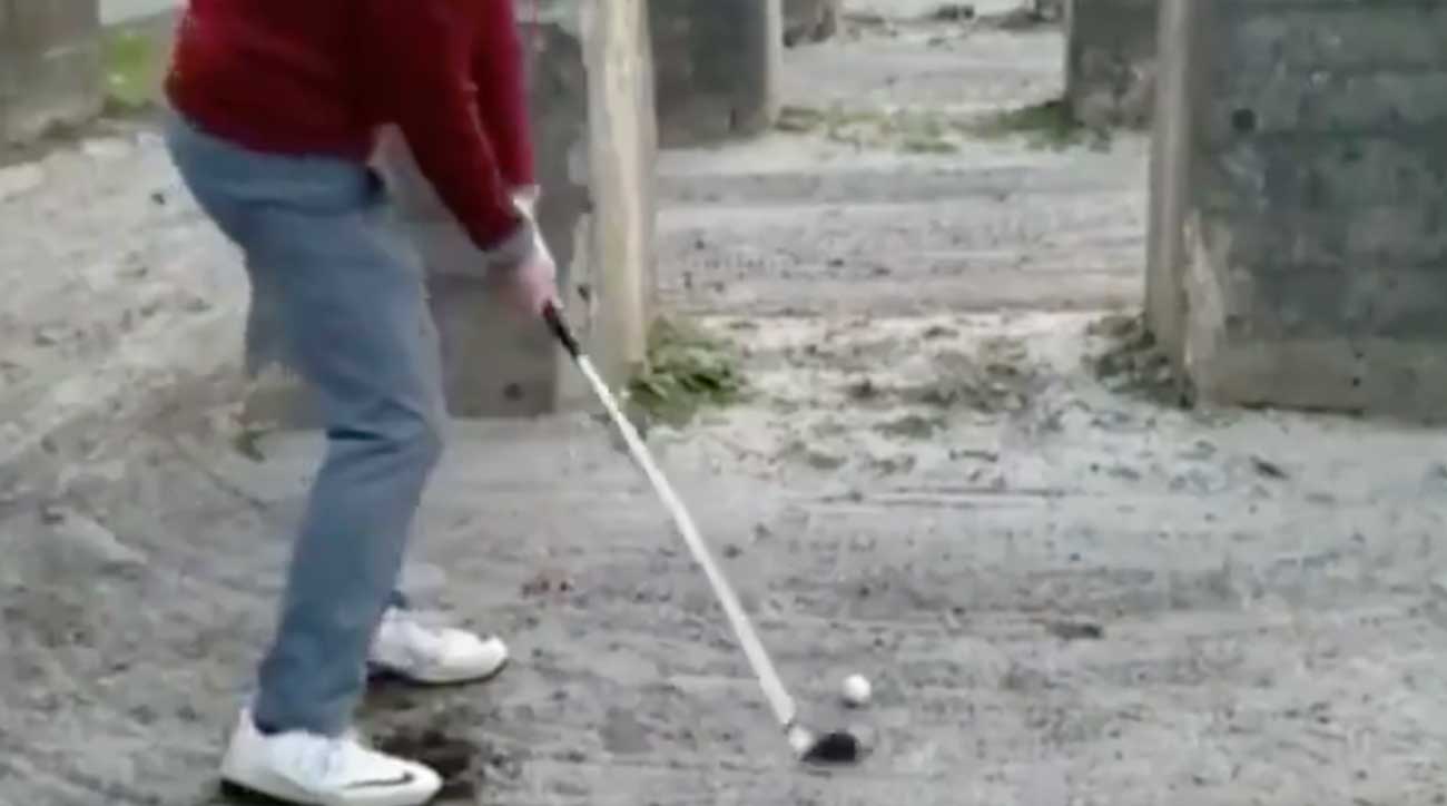 The emoji part was used because, well, you’ll see. This was a stinger gone wrong, but it’s fascinating to watch. The golfer tries to line the ball though a tunnel of pillars, but he pulls it and a couple of ricochets leads to the camera/phone taking a hit (hopefully the man behind the lease is OK).