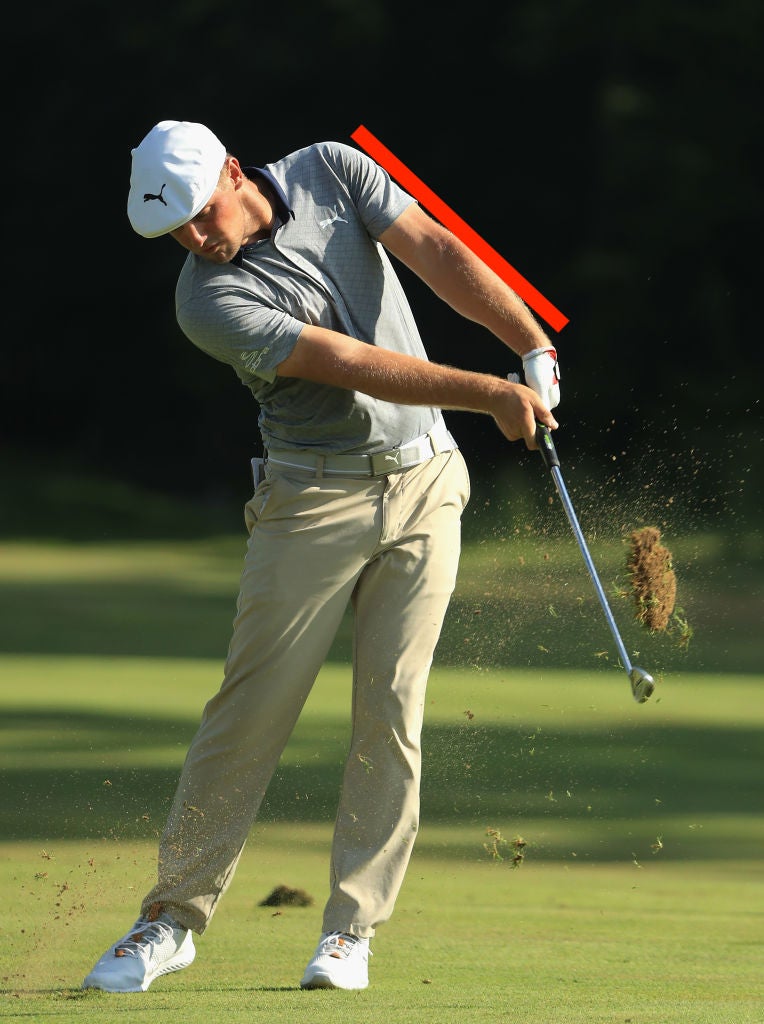 It’s hard not to notice that Bryson sets up to the ball a little differently than most people. He’s slightly more upright, and most notably, he keeps his left arm very straight. We won’t go into all the reasons why, but in its simplest terms: players’ left arms straighten as they swing into impact. Rather than keeping his arms loose at address and then straightening, Bryson just keeps his arms straight to begin with. Less moving parts is a cornerstone of Bryson’s swing philosophy.