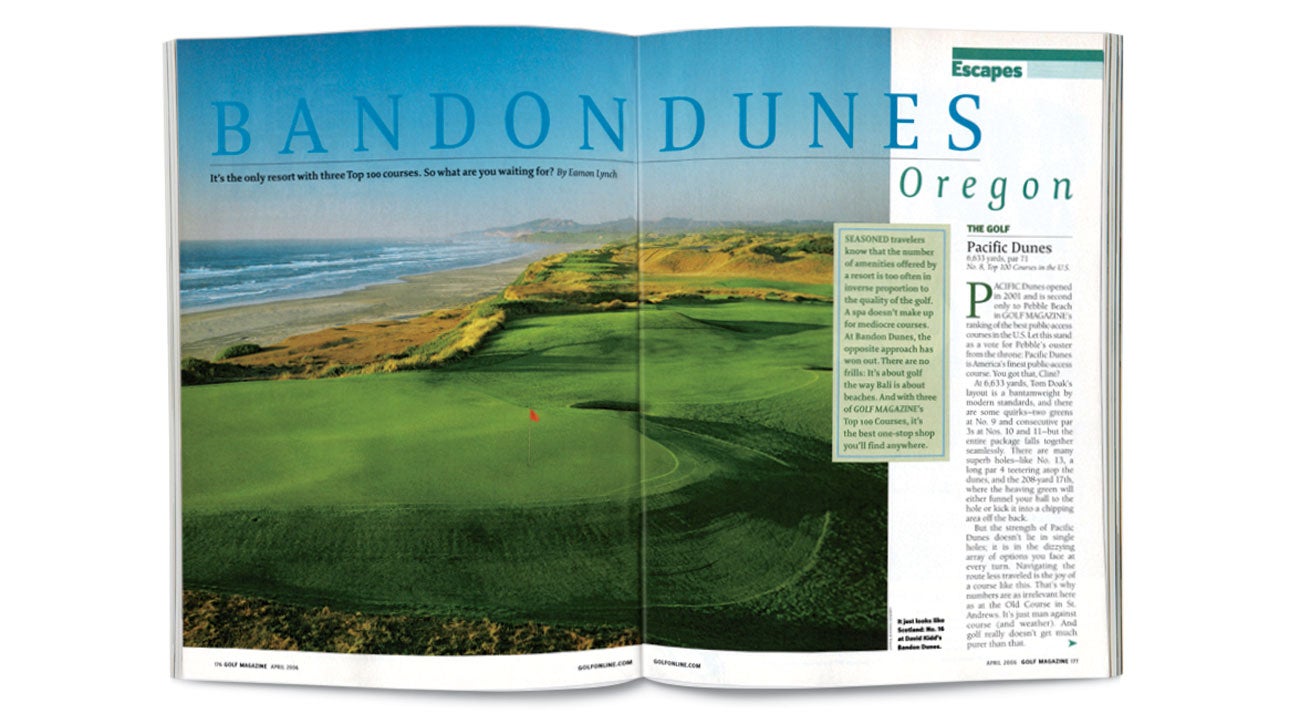 Seasoned travelers know that the number of amenities offered by a resort is too often in inverse proportion to the quality of the golf. … At Bandon Dunes, the opposite approach has won out. There are no frills: It’s about golf the way Bali is about beaches.” (Apr. 2006)