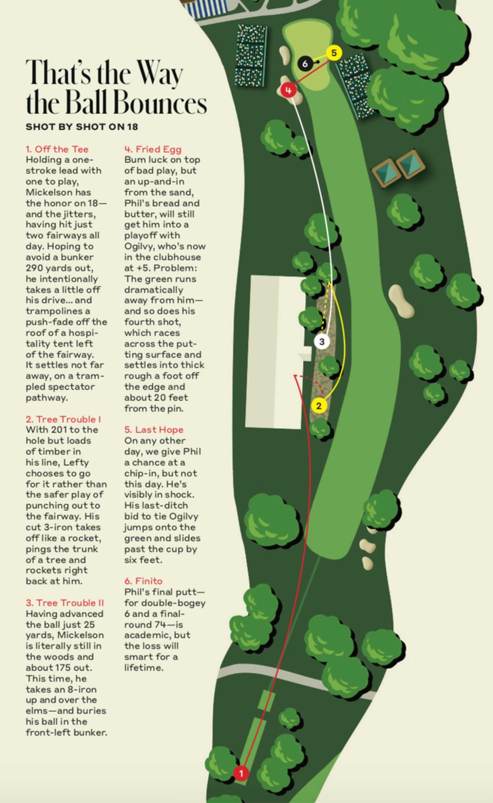 Hicks: Phil was on an absolute roll, going for three major titles in a row. But something in the back of my mind was telling me, You tempt Winged Foot this many times without finding the fairway, you’re gonna pay the price. Of course, it wasn’t a 4-wood, and Phil bounced his drive off a hospitality tent.