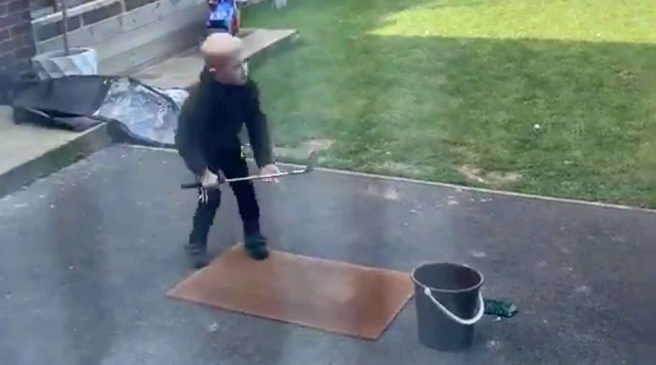 Leon’s dad, Chris Calvert, had set up a makeshift, 30-yard hole in his backyard as the coronavirus has forced people across the globe to stay at home. Dad said that he cut down an old club for Leon; a few days earlier, he tweeted a photo of Leon holding a full-length club, along with a comment to pro Tommy Fleetwood asking for advice on clubs for kids. Leon had taken a few swings at the hole — a yellow bucket — but had come up short, long, left or right.