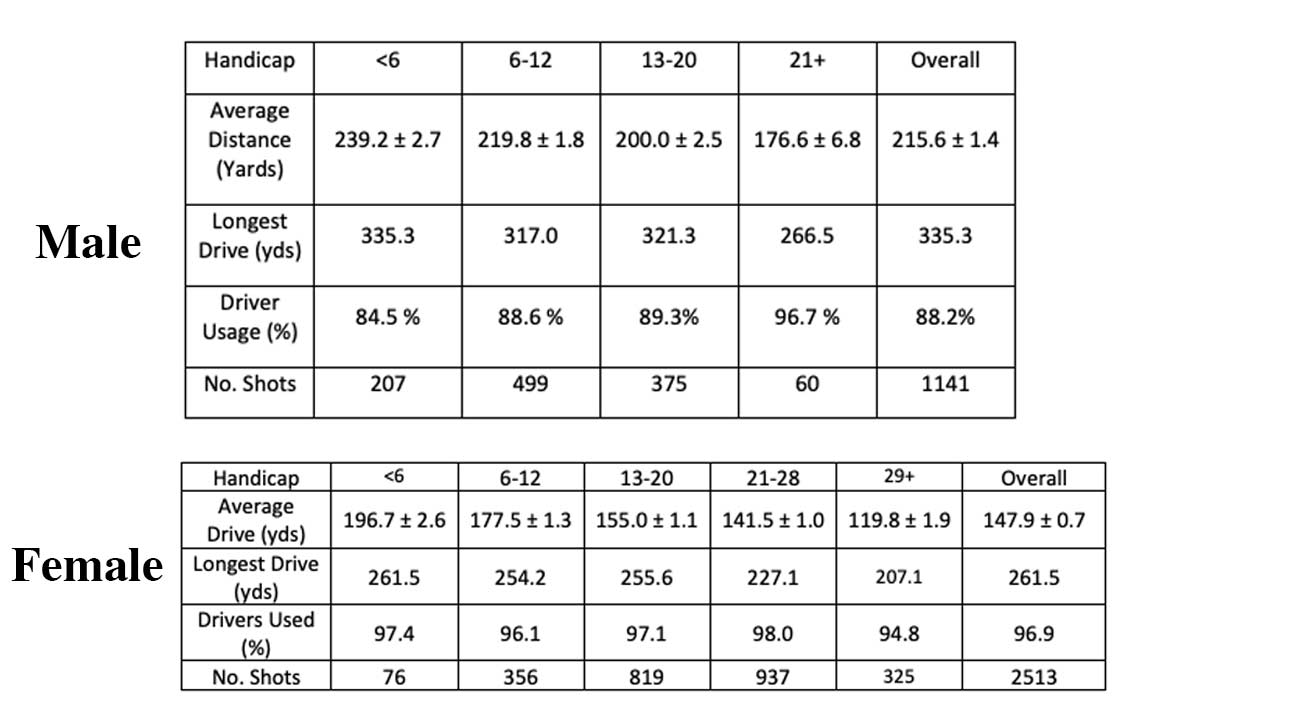 The data for male golfers was collected annually since 1996 at six different venues in the UK, usually between May and September. For female golfers, there were eight different venues visited annually since 2013, with one venue being visited annually since 2014. Time of year and competition constants were utilized where possible and the data collection was similar to the Shotlink system used by the PGA Tour.