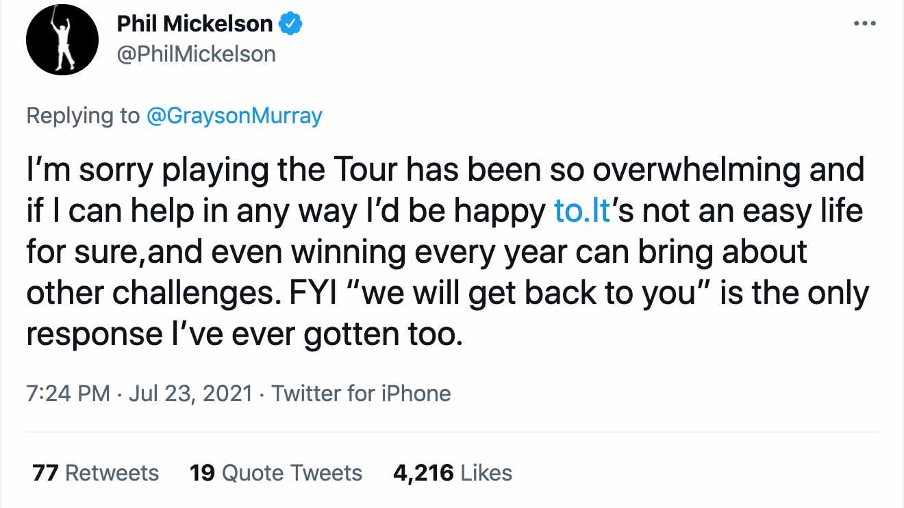 “I’m sorry playing the Tour has been so overwhelming and if I can help in any way I’d be happy to,” Mickelson responded. “It’s not an easy life for sure, and even winning every year can bring about other challenges.