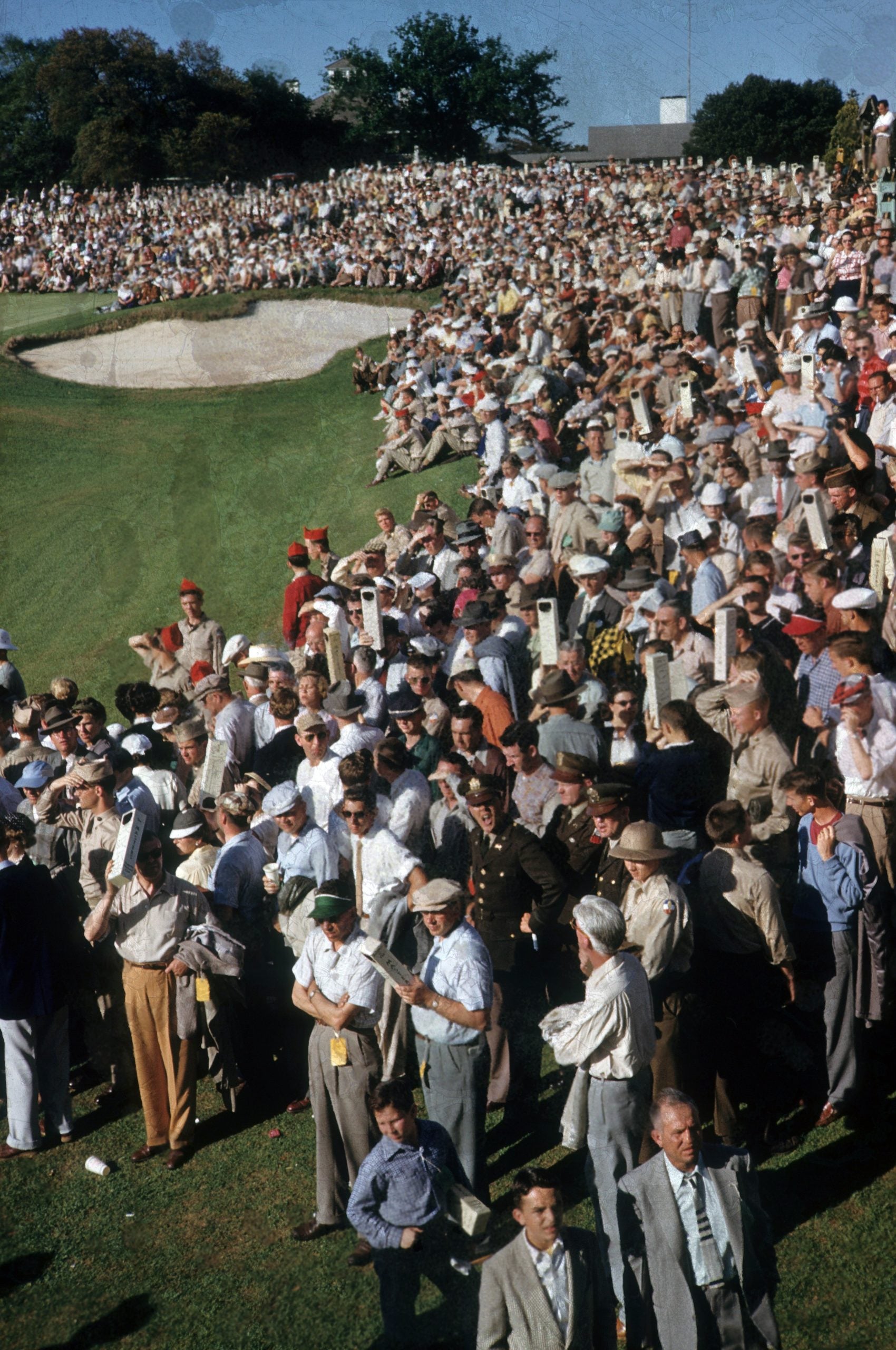On April 11, 1954, patrons wait by the 18th green.