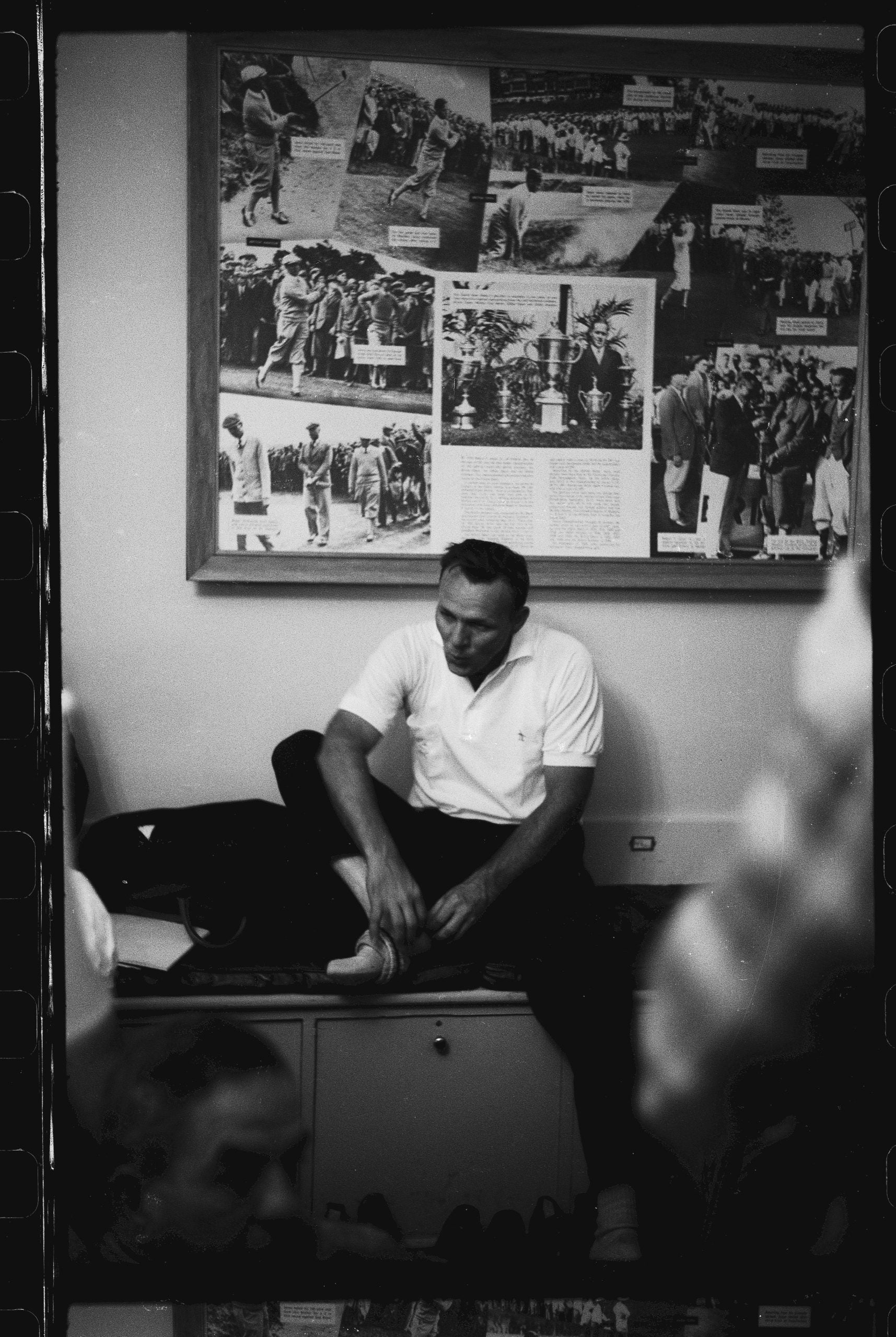 Arnie, who went on to win four green jackets, laces up his shoe during the 1960 Masters.
