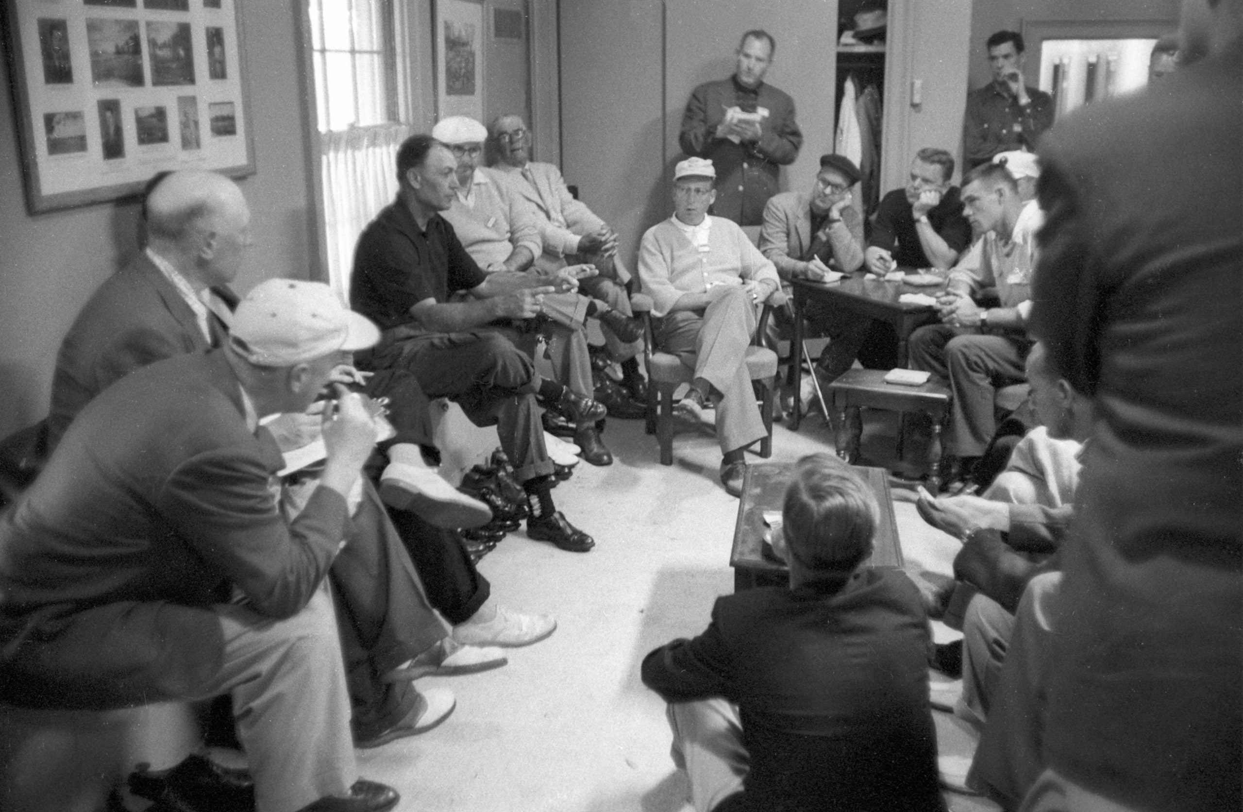 Ben Hogan (left, in black) chats with the media in the Augusta National clubhouse on April 6, 1957.