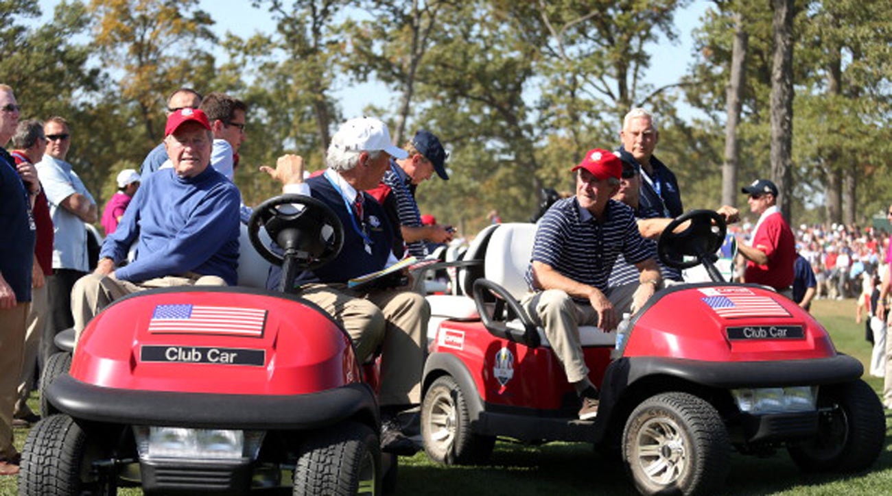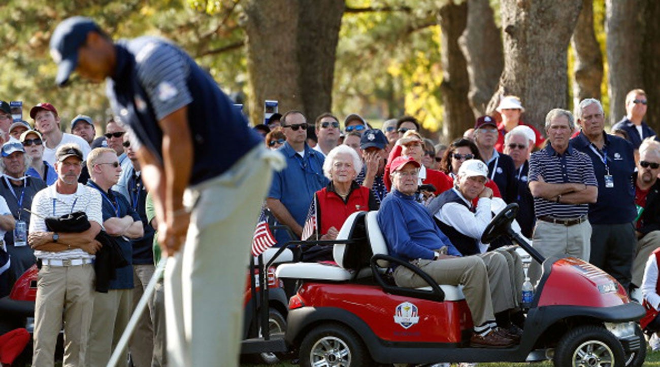 George H.W. and Barbara Bush, as well as George W. Bush, watch Tiger at the 2012 Ryder Cup.
