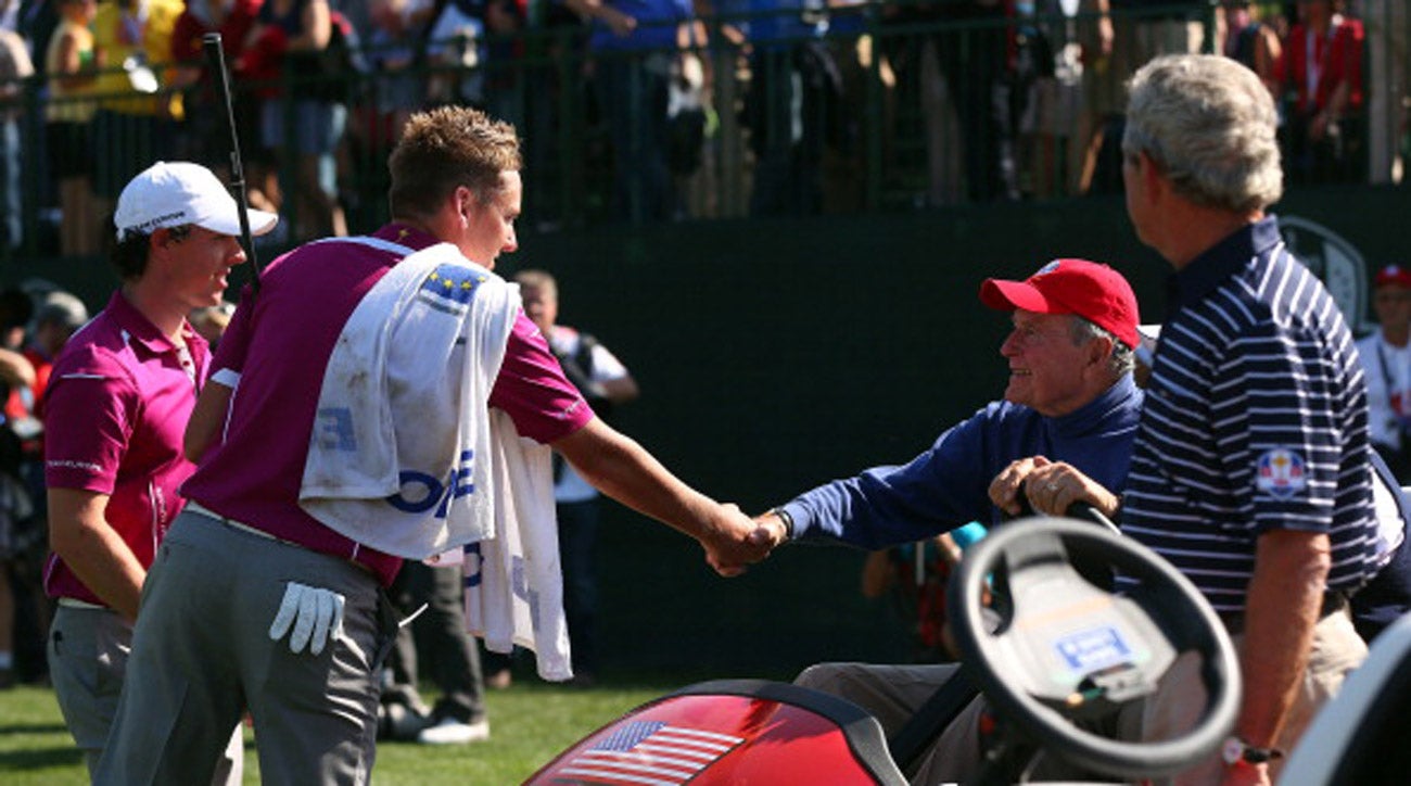Bush shakes hands with Ian Poulter and Rory McIlroy at the 2012 Ryder Cup.