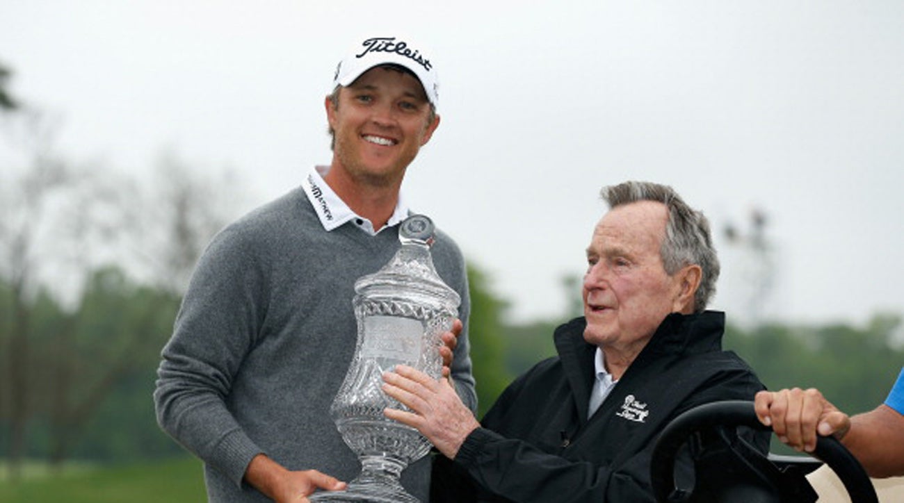 Bush 41 awards Matt Jones of Australia the Shell Houston Open trophy in 2014.