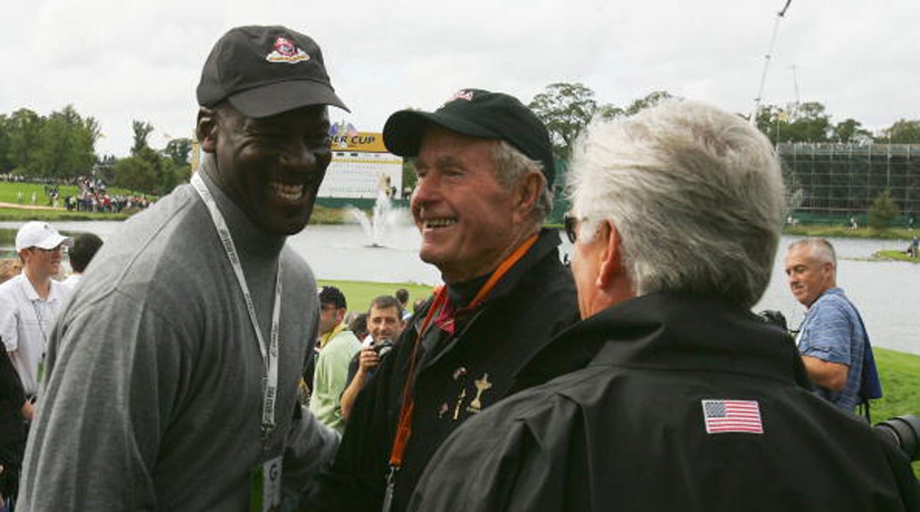 Bush chatting with fellow golf nut Michael Jordan at the 2006 Ryder Cup.