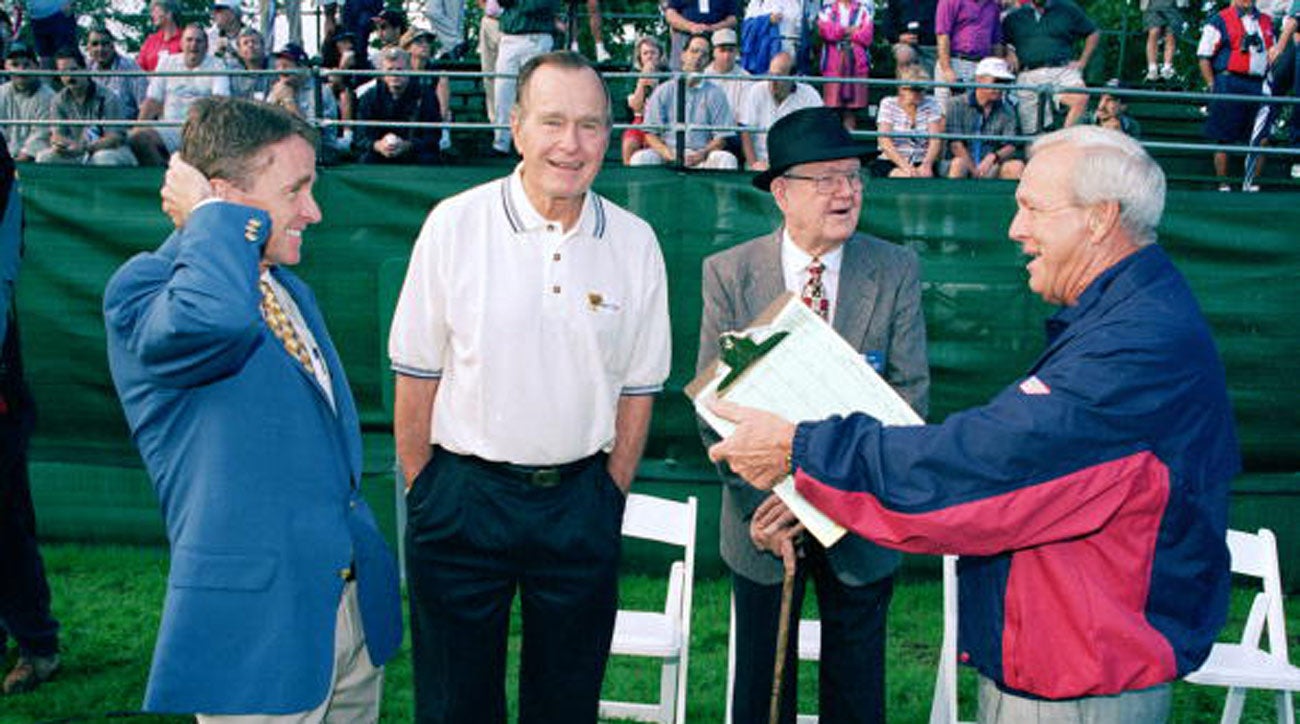 Bush 41 at the 1996 Presidents Cup with Arnold Palmer, Byron Nelson, and Tm Finchem.