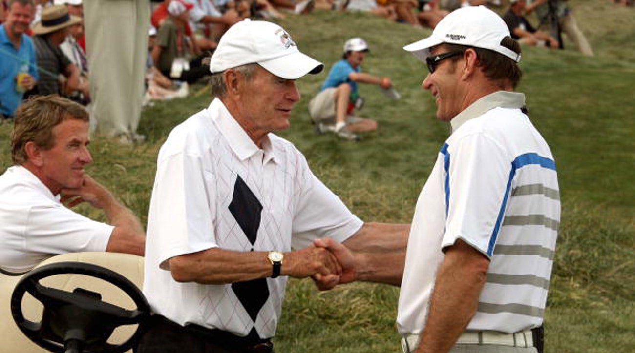 Nick Faldo and Bush 41 shake hands and hang out at the 2008 Ryder Cup.