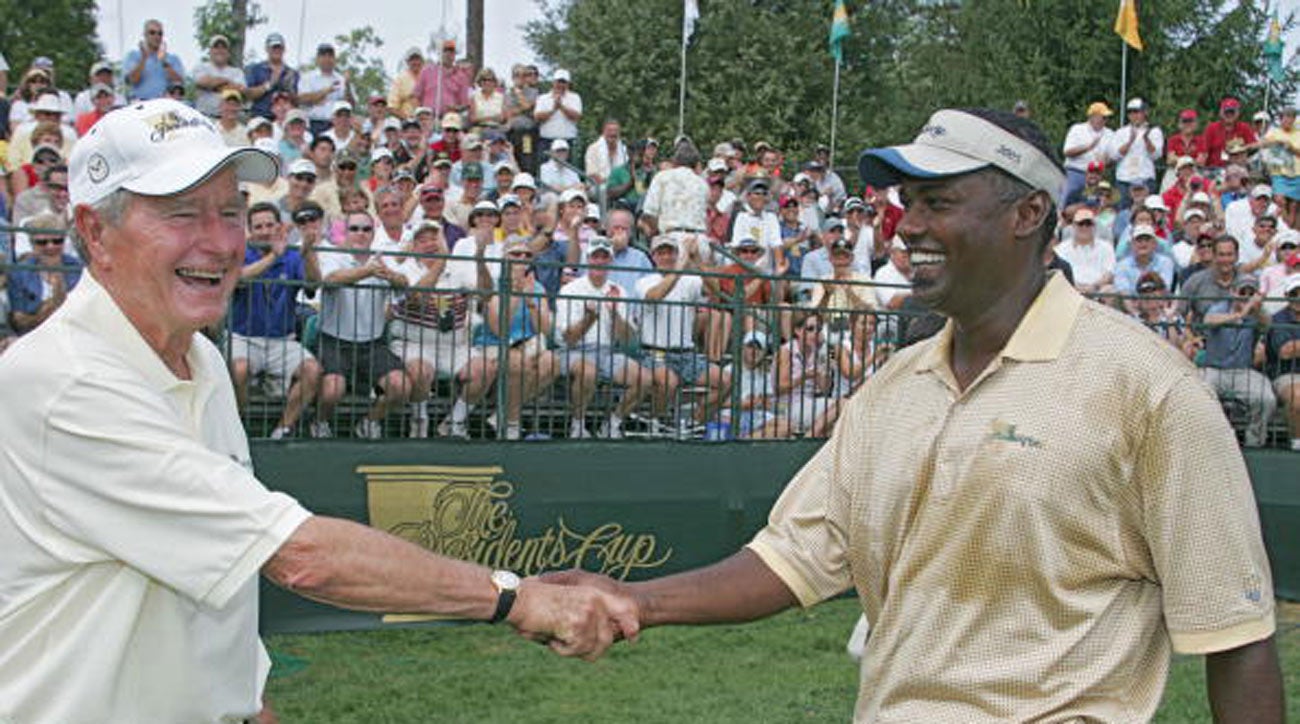 Bush 41 and Vijay Singh shake hands at the 2005 Presidents Cup.