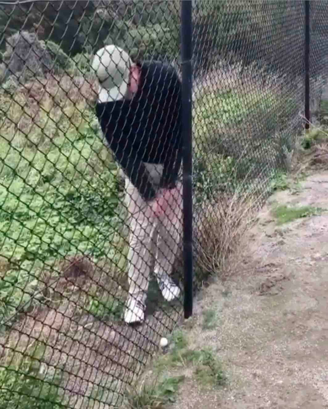 The players’ ball came to rest up against a fence. And when we say up against a fence, we don’t mean sort of close to the fence. I mean, literally, up against the fence. So much so that the only way he could hit the shot was to climb over to the other side and play from there.