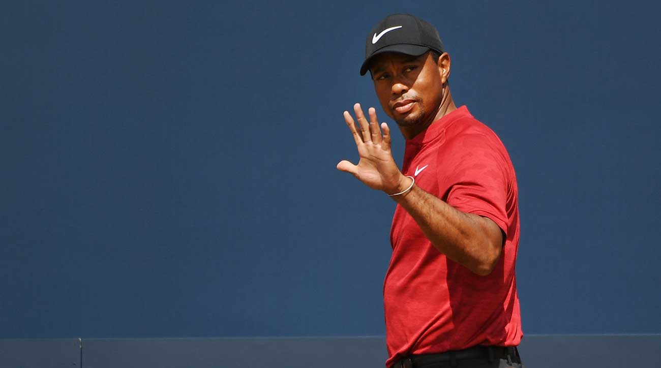 Facing difficult conditions on a hard and fast Carnoustie course, Tiger Woods fired a two-under 34 on the outward nine on Sunday to tie for the lead at the 2018 British Open.