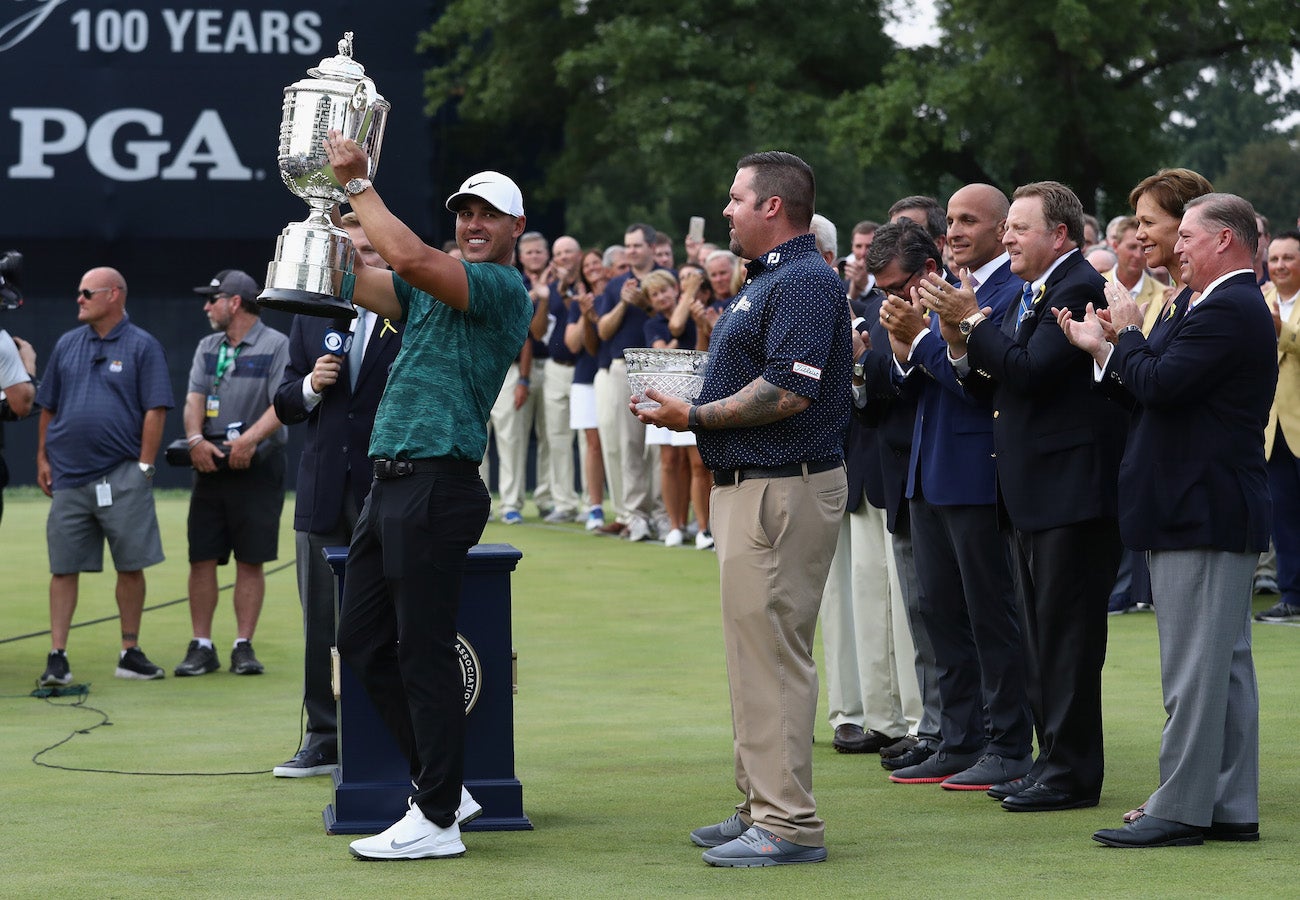 Brooks Koepka celebrates with the Wanamaker Trophy on the 18th green after winning the 2018 PGA Championship.