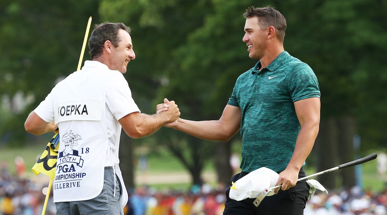 Brooks Koepka celebrates with caddie Ricky Elliott after winning the 2018 PGA Championship.