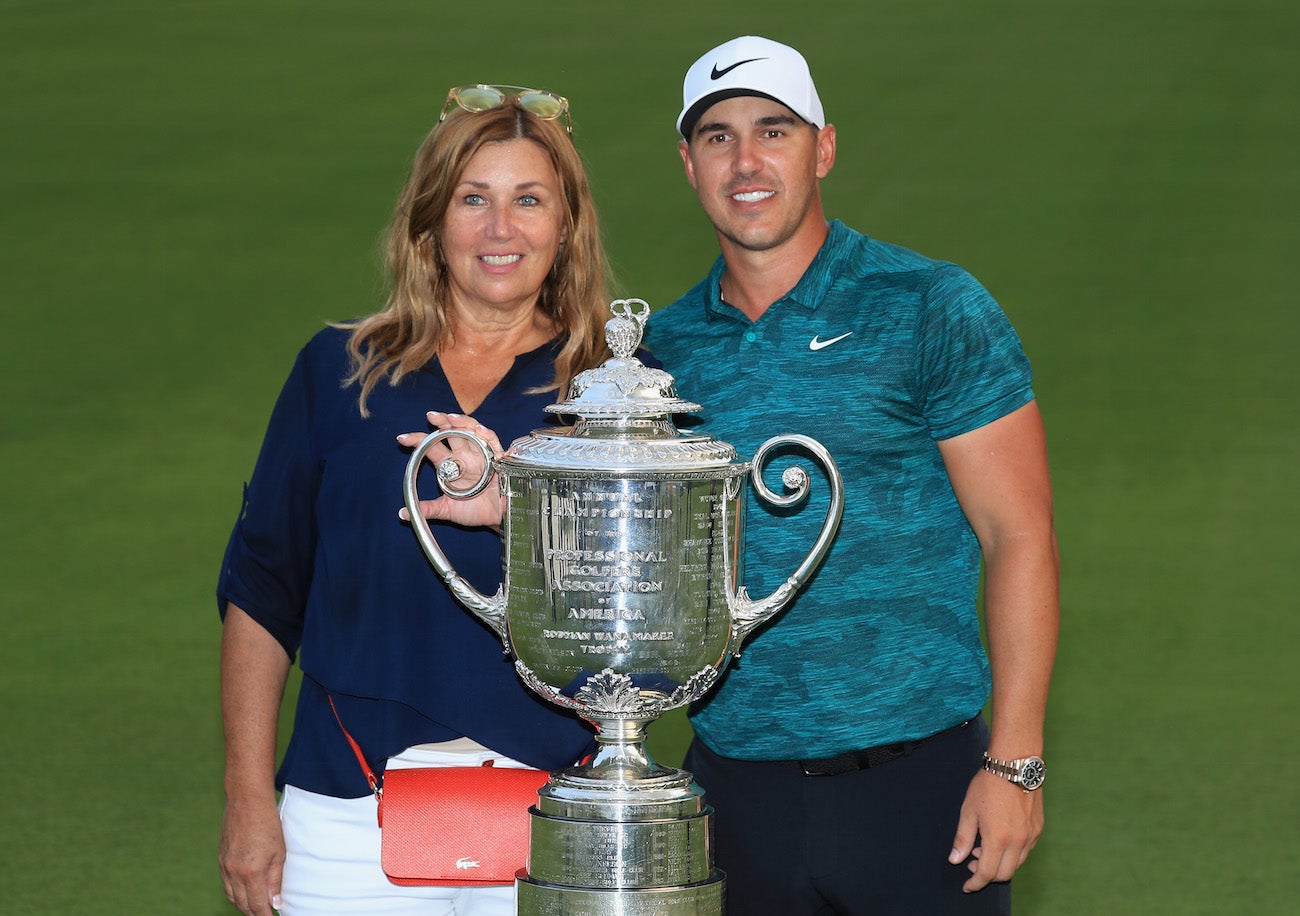 Brooks Koepka and his mother, Denise Jakows, pose with the Wanamaker Trophy on the 18th green after Koepka won the 2018 PGA Championship.