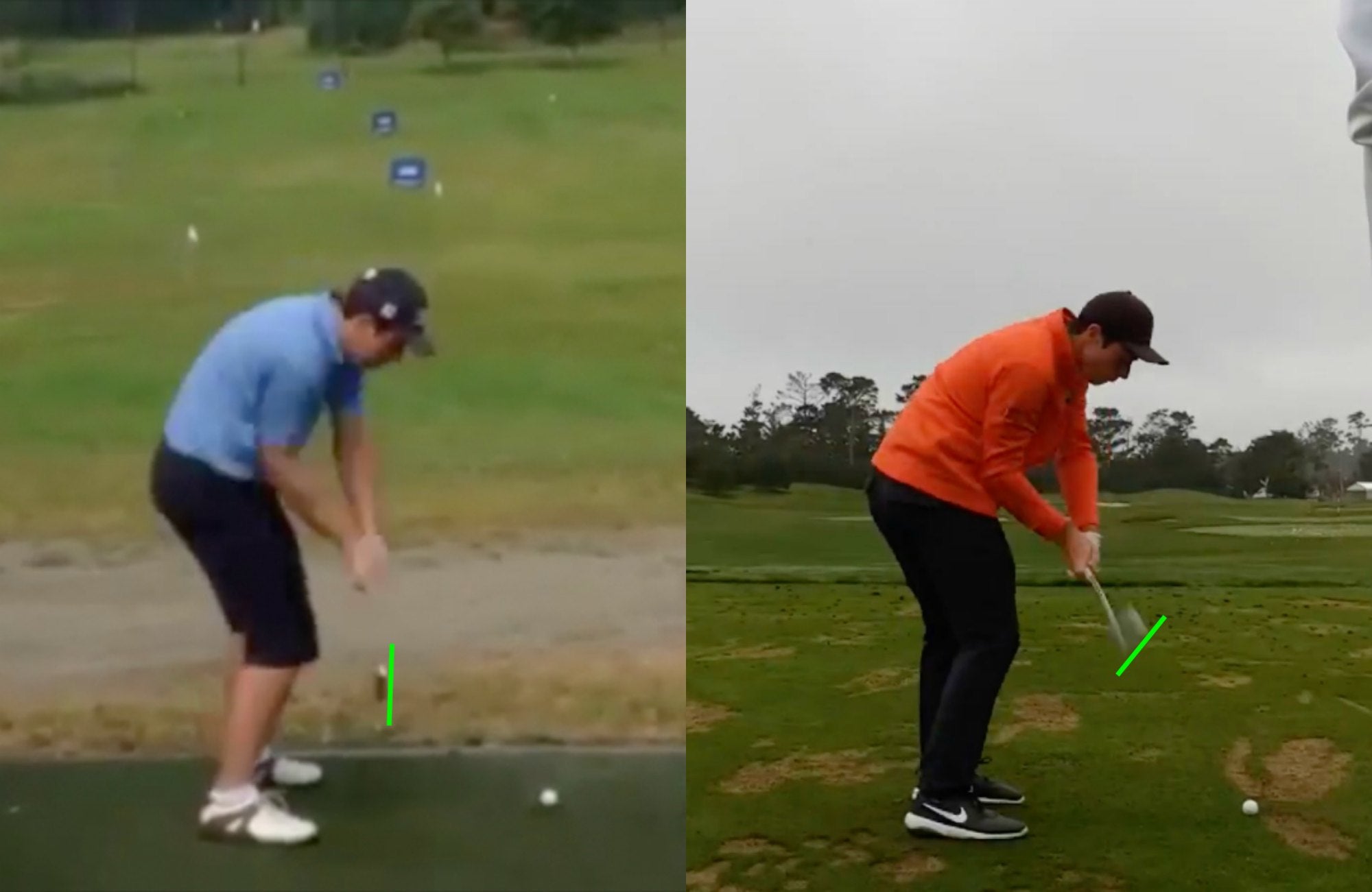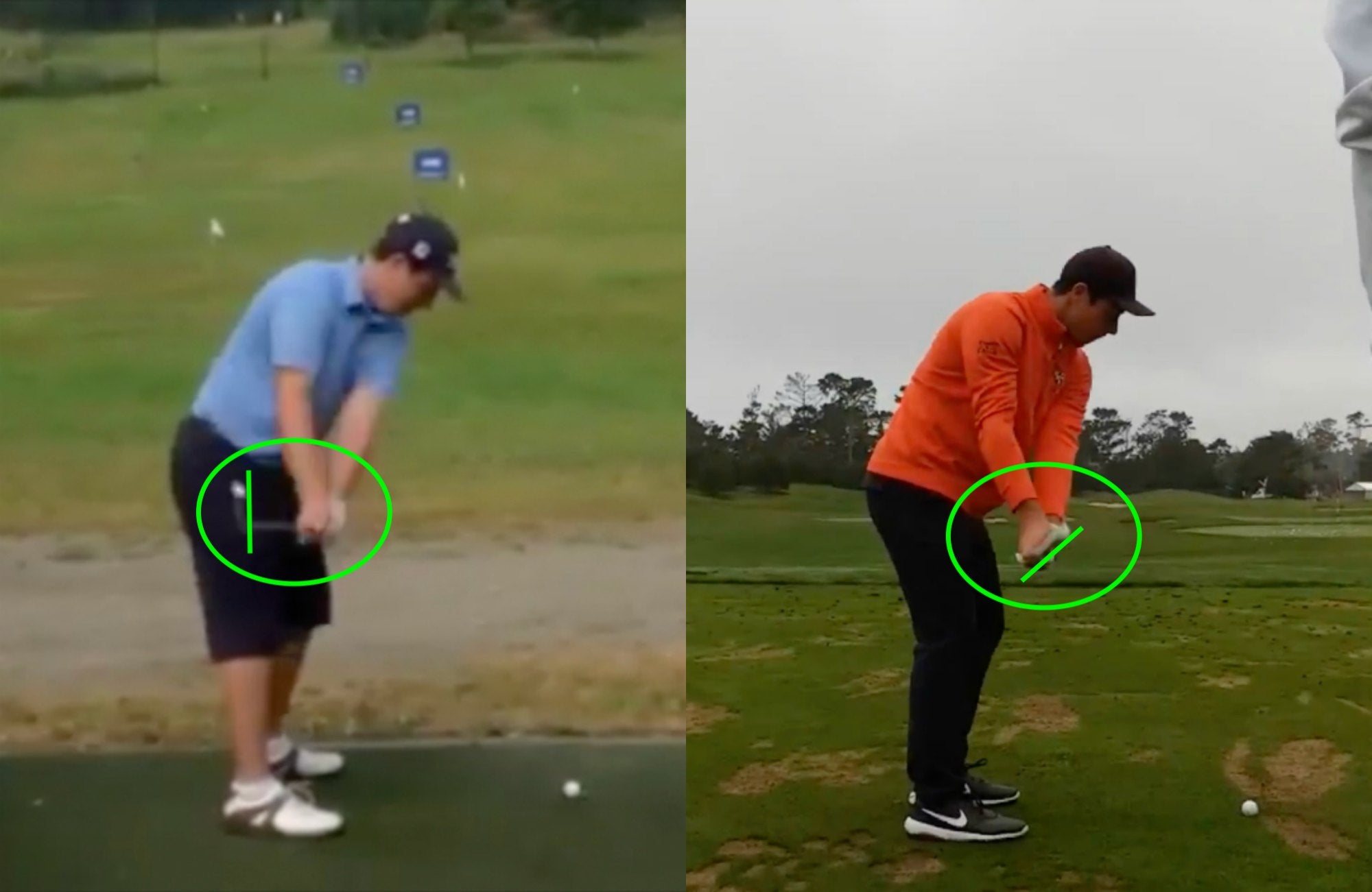 Immediately you start to see the differences. Young Hovland on the left starts his swing by rolling the clubface open and inside on the takeaway — something that could lead to a big slice if he doesn’t compensate for it later in his swing.