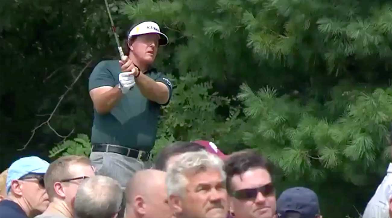 And Mickelson, fresh off a pair of 68s in his first two rounds at Ridgewood, got off to a another good start on Saturday. Playing the par-3 2nd hole, Mickelson took a swing with an eight-iron and watched as the ball tracked toward the pin.