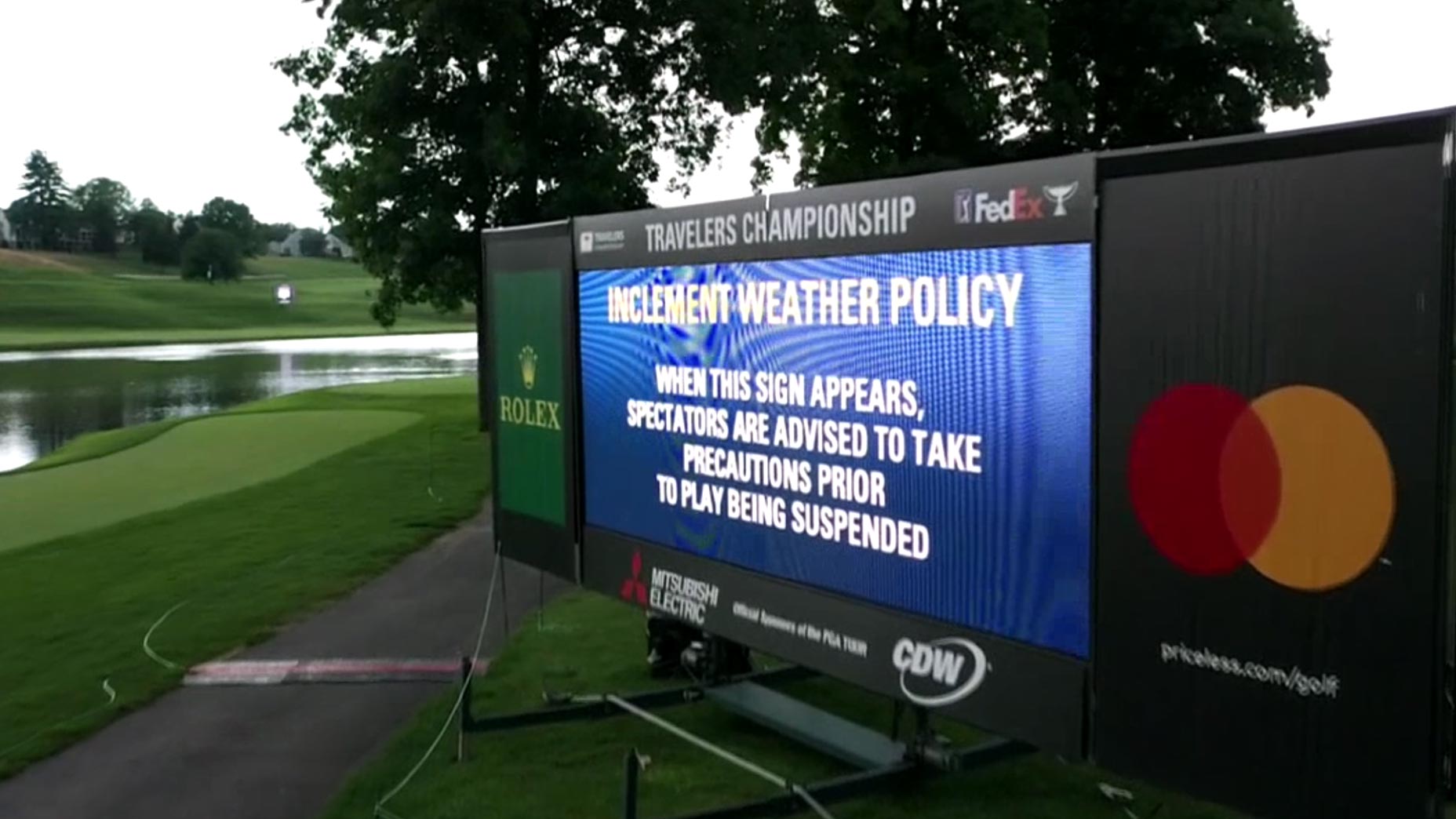 Lightning in the area suspended play at 5:17 p.m. ET with Dustin Johnson leading at 20 under. Johnson is in the final pairing with Brendon Todd and they have three holes left. Kevin Streelman is in second (18 under) and has two holes remaining. The clubhouse leader is Will Gordon at 17 under.
