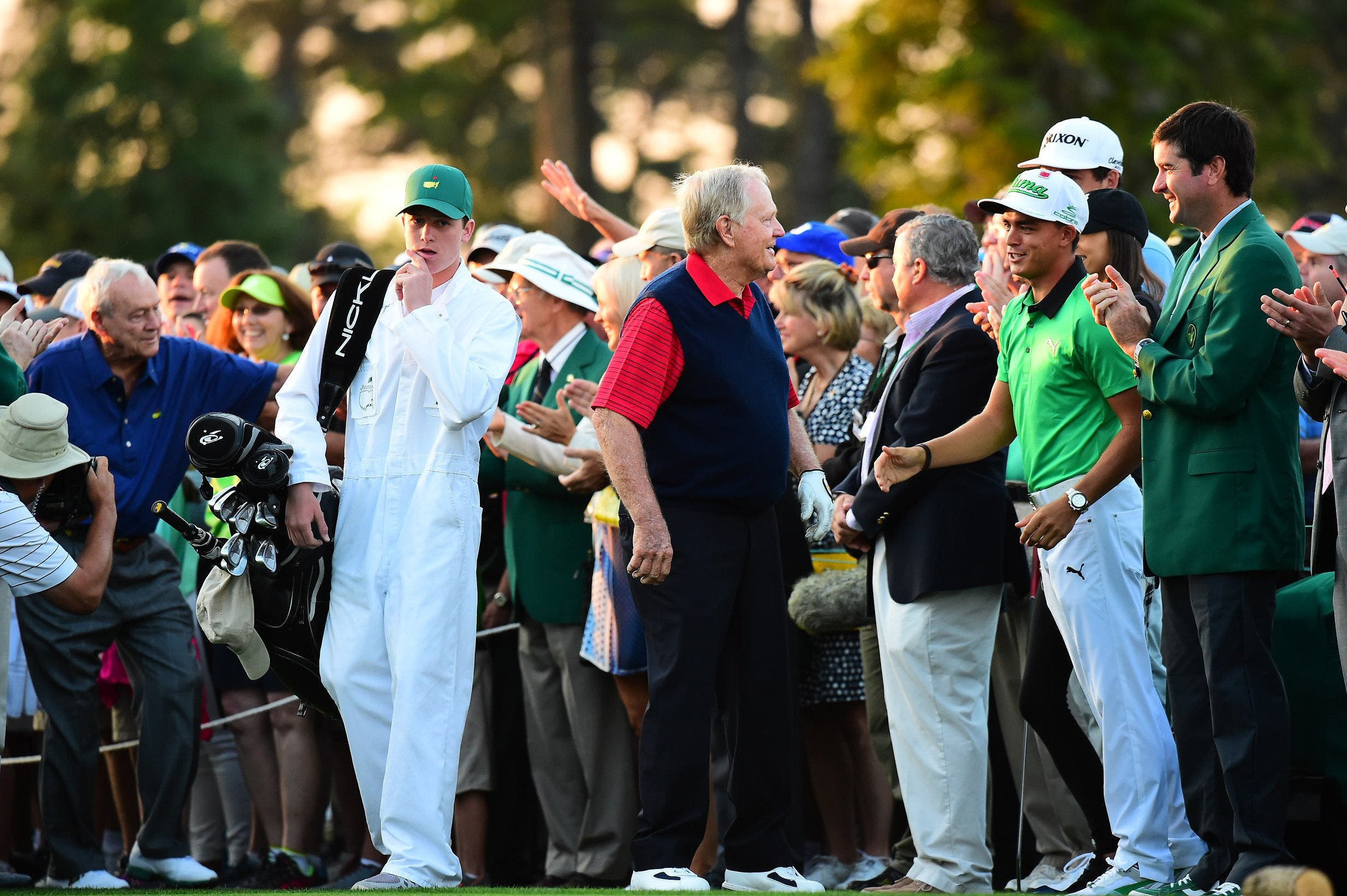 Jack Nicklaus says "hi" to Rickie Fowler and Bubba Watson when he arrives on the first tee at Augusta National.
