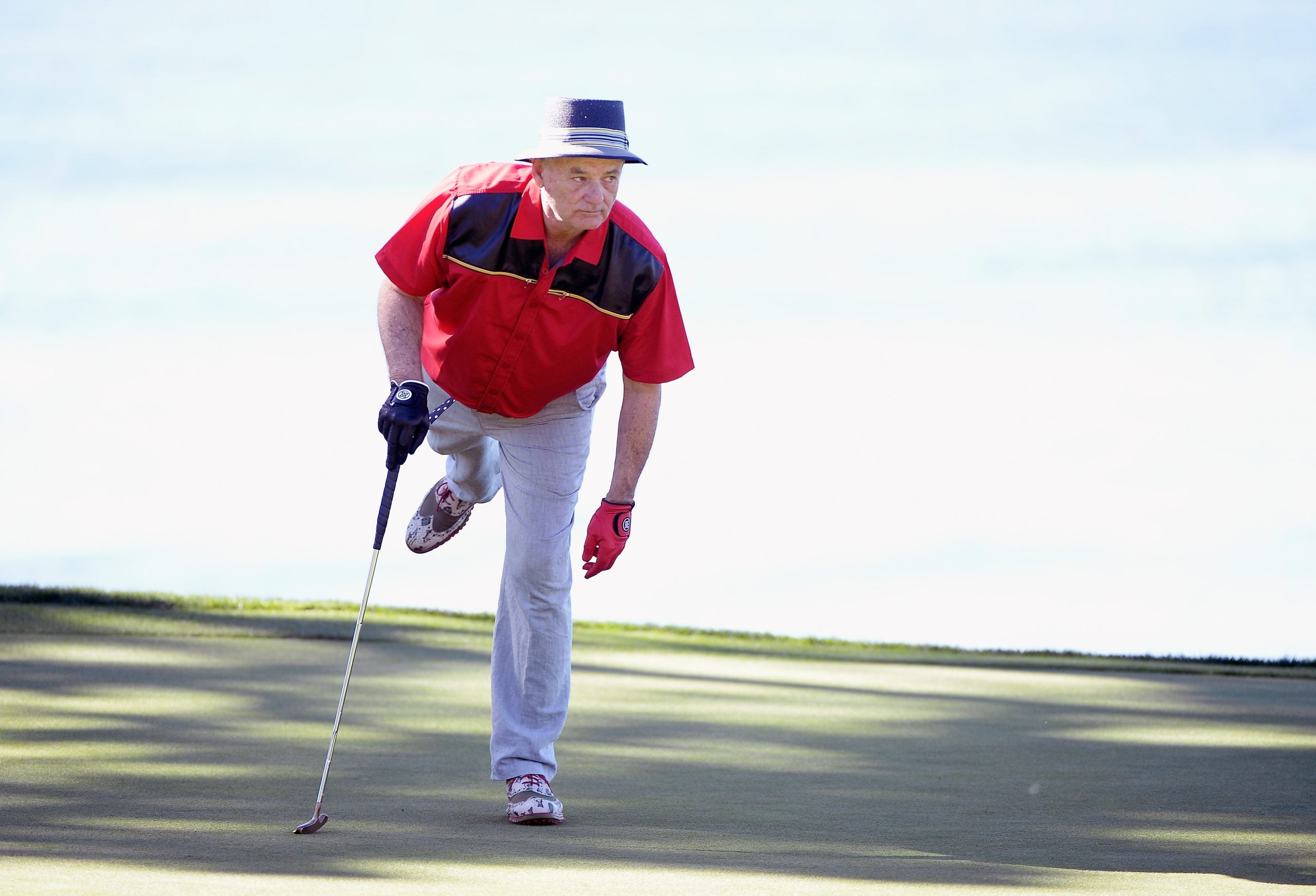 Actor Bill Murray watches a putt on the fifth green during the third round of the AT&T Pebble Beach National Pro-Am at the Pebble Beach Golf Links on February 14, 2015 in Pebble Beach, California.