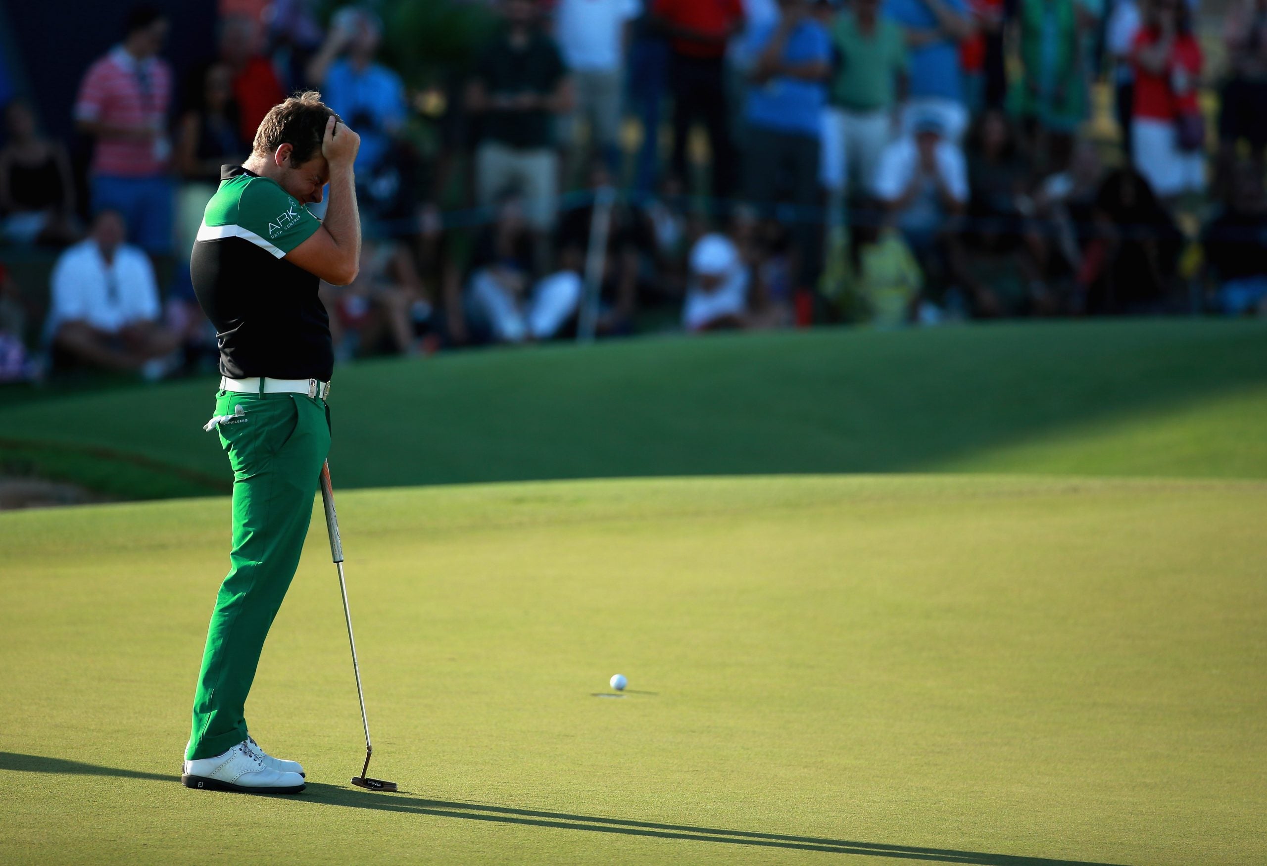 Tyrrell Hatton of England reacts to a missed putt on the 18th green during the third round. Hatton is tied for fourth with Rory McIlroy, Victor Dubuisson, and Thorbjorn Olesen. He shot 68 on day three.