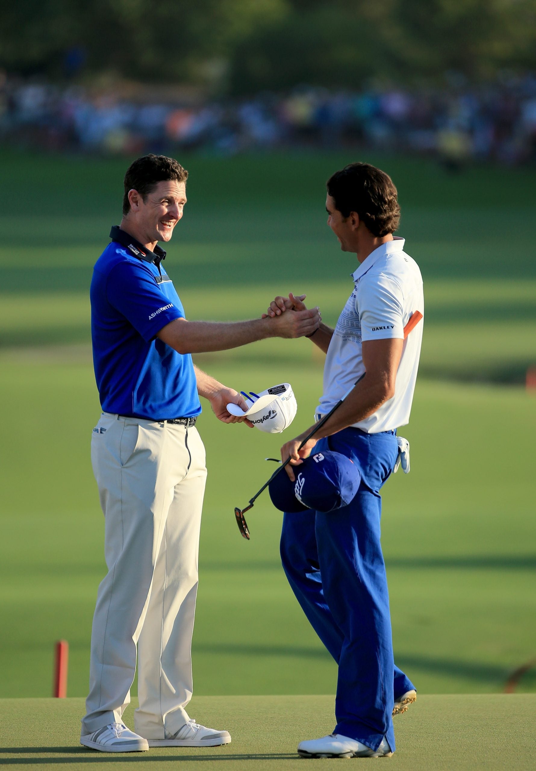 Rafa Cabrera-Bello of Spain (R) and Justin Rose of England shake hands after they had both made birdie at the par 5, 18th hole. Justin Rose sits third, shooting a third-round 68.
