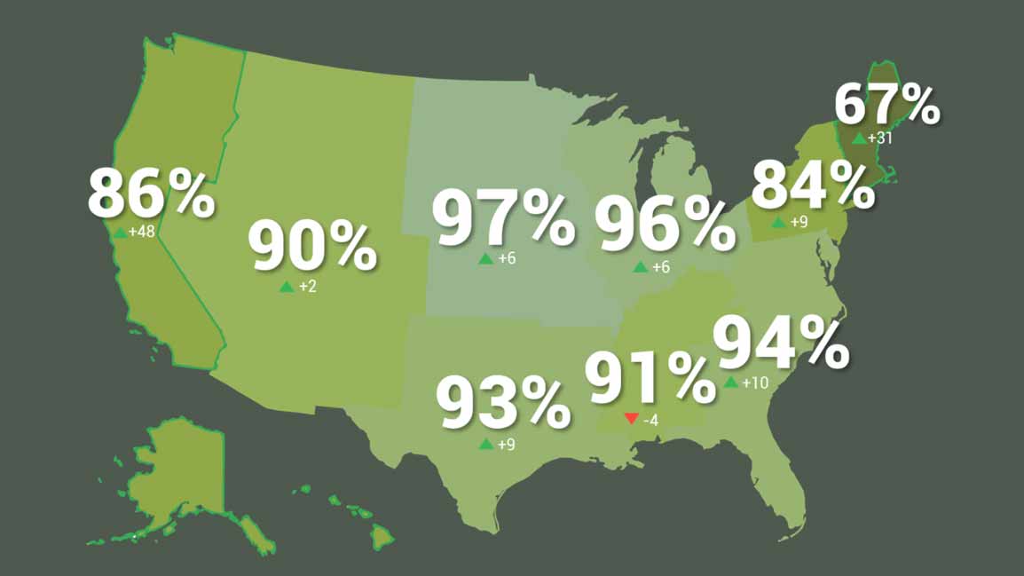 By region, the biggest jump came from the West Coast, which opened courses at a dramatic rate and leapt from 38% open on May 4 to 86% on May 11. New England is open at the lowest rate — just 67% — but that number was expected to rise, as Massachusetts and Vermont opened over the weekend and New Hampshire was scheduled to open on Monday.