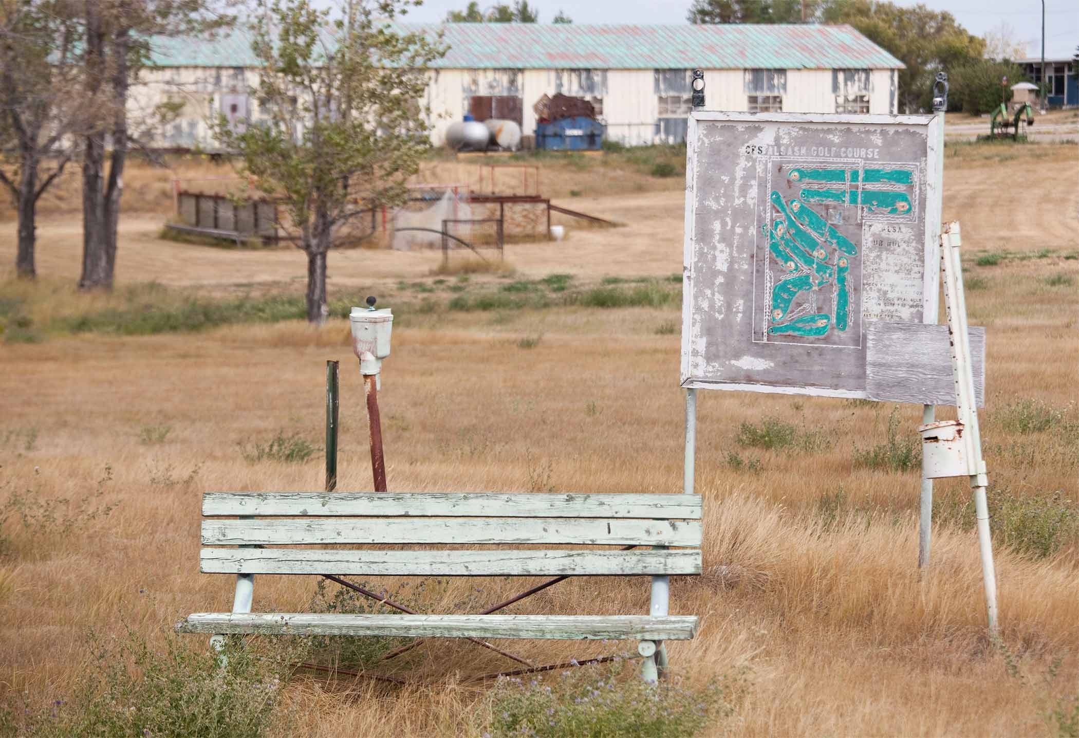 However, the following day things went downhill. In ramshackle towns like Sceptre, Hershel, Alsask, and Stranraer — all places where, allegedly, sand-green courses existed — there was little left to see. However, in Hoosier the course was still there. Kind of. Overpowered by weeds and wind, it was a dismal sight. Rusted benches and ball washers peaked above the prairie grass like periscopes. Inside the abandoned clubhouse shack (I had permission to be there) I found a moth-eaten flagpole and planted it in a “green” for a photo. I figured it was time a flag was flickering on the course again. It had been 10 years.