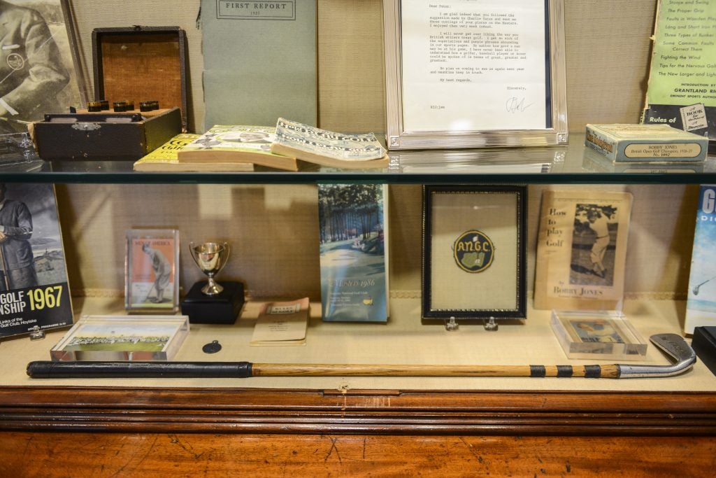 ATLANTA, GA - AUGUST 27: A Spalding Kro-Flite Bobby Jones Calamity Jane putter, foreground, and other Jones memorabilia on display in the Bobby Jones room at East Lake Golf Club on August 27, 2014 in Atlanta, Georgia. East Lake will host the TOUR Championship by Coca-Cola, the final event of the FedExCup Playoffs, from Sep. 10 through Sep. 14. (Photo by Keyur Khamar/PGA TOUR)