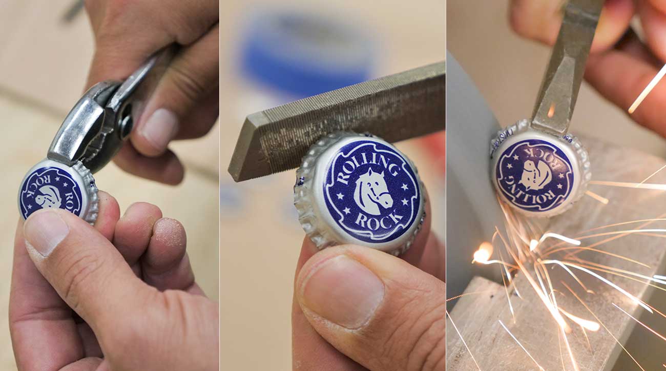 2. Once you have both bottle caps flattened, the next step is to grind the edges down. You can do this with a metal file (it’ll take a while), or you can use a grinder like we are in the photo below. Both methods work, but be careful not to grind too much of the edges. You want to leave a little radius around there so when the two are put together they touch on the edges and not in the middle of the caps.