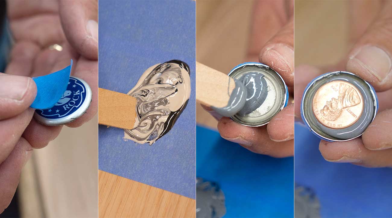 4. Grab a penny and mix together some five-minute epoxy to bond the two sides of the caps together. I recommend using a gray epoxy since it blends in better with the cap, but feel free to use any color (or clear) you wish. The penny is used to add weight to the ball marker so it holds its position on the green and doesn’t easily fall out of your pocket; I learned this the hard way. Use masking tape on the bottle caps to prevent getting excess epoxy on the bottle cap logos. You can use the scissors to cut the tape to size. Place the penny in the mixed epoxy between the two bottle caps and squeeze together.