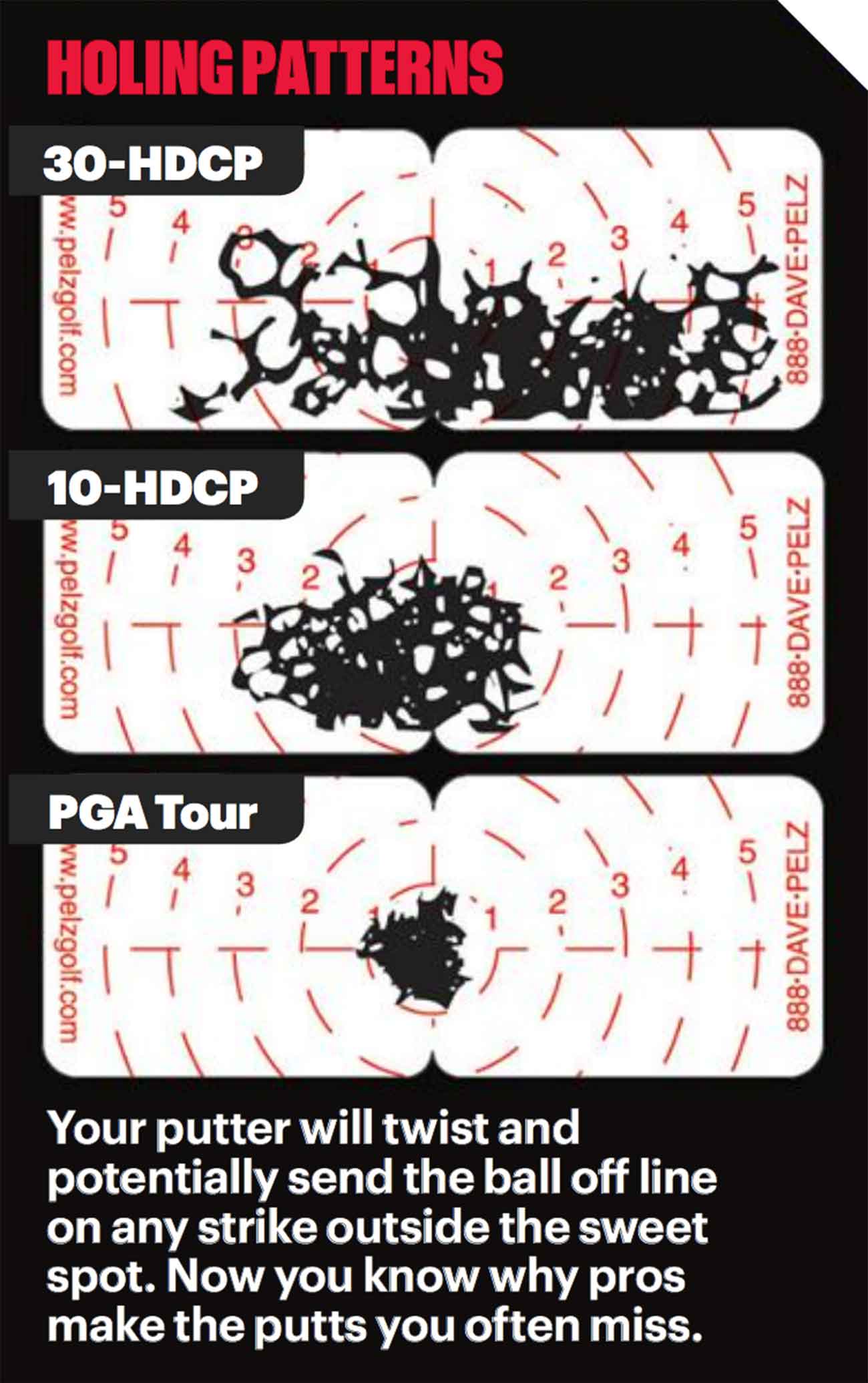 I’ve learned a few things about the game over the years that are truly meaningful, and striking putts on the sweet spot is one of them. For proof, look at the putting impact patterns above, taken from a typical 30-handicapper (top), a 10-handicapper (middle) and a PGA Tour player (bottom). The difference in impact consistency is staggering.