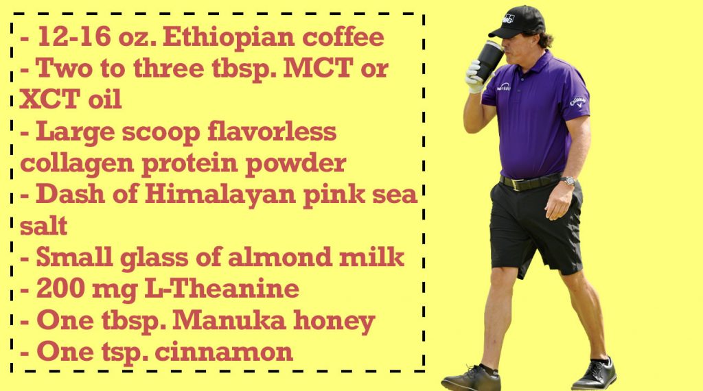 On that front, we’ve made a big change. My burgeoning relationship with the bagel guy on 44th Street is no longer, as a snack in the morning is all we need to make it to my salad at lunch. As for Mickelson, he lost 15 lbs. initially, and in eating just twice a day now, he’s dropped just as much in the months since. He even performed a 3-day fast last weekend to reset his immune system before the glut of his Tour season begins. The truest effect of the Mickelson fast — for both of us — is sustained energy on the back end. Where I once came home and got comfy on the couch, I now detour to the gym and get un-comfy … in a good way. Somehow smiling throughout.