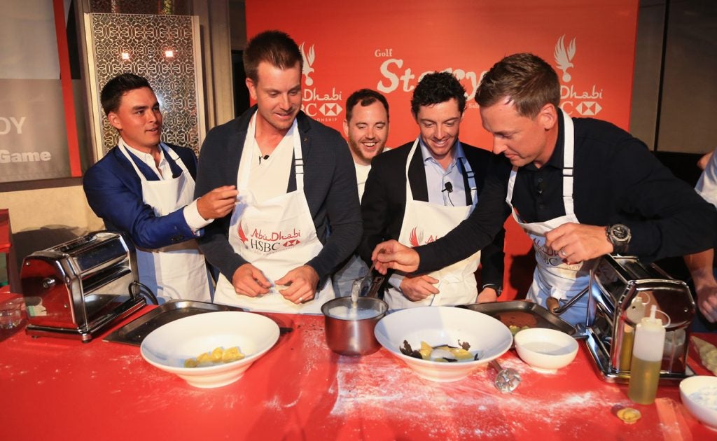 Rickie Fowler, Henrik Stenson, Rory McIlroy and Ian Poulter work with award-winning chef Tom Sellers during the 2016 HSBC Golf Story cooking challenge.