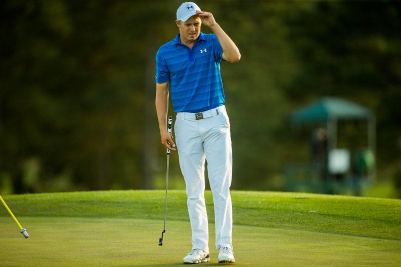 Jordan Spieth reacts following his last putt at the 18th green during the final round.