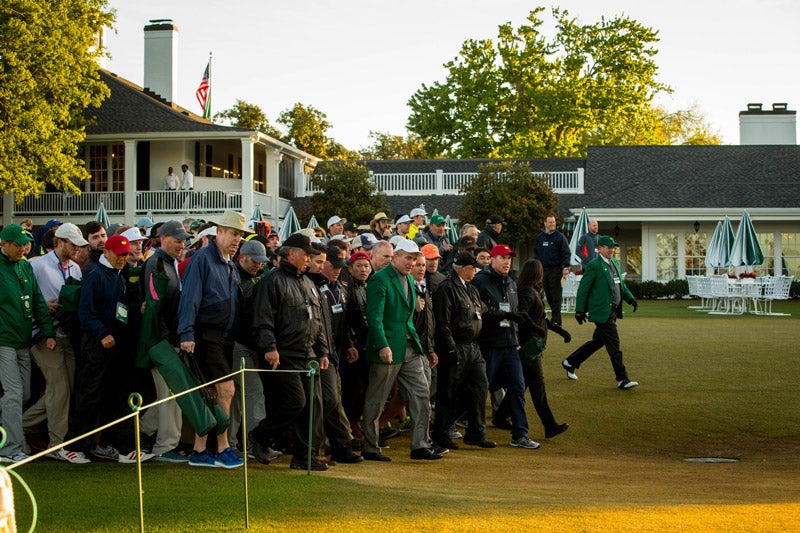 Early Sunday morning, members and security personnel lead the first patrons through the gates and on to the area surrounding the 18th green to reserve spots to view the final hole of the 2016 Masters.