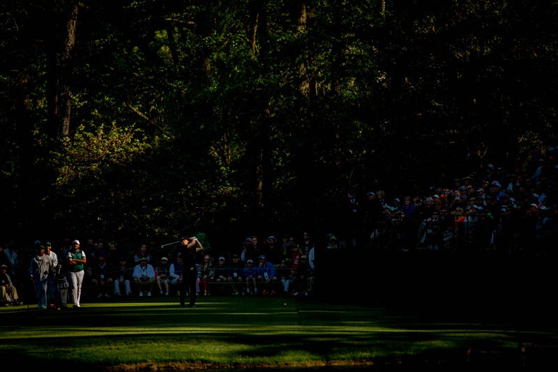 2011 Masters champion Charl Schwartzel of South Africa tees off at the first hole.