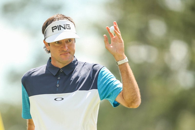 2012 and 2014 Masters champion Bubba Watson acknowledges the gallery at the first green after a birdie putt.